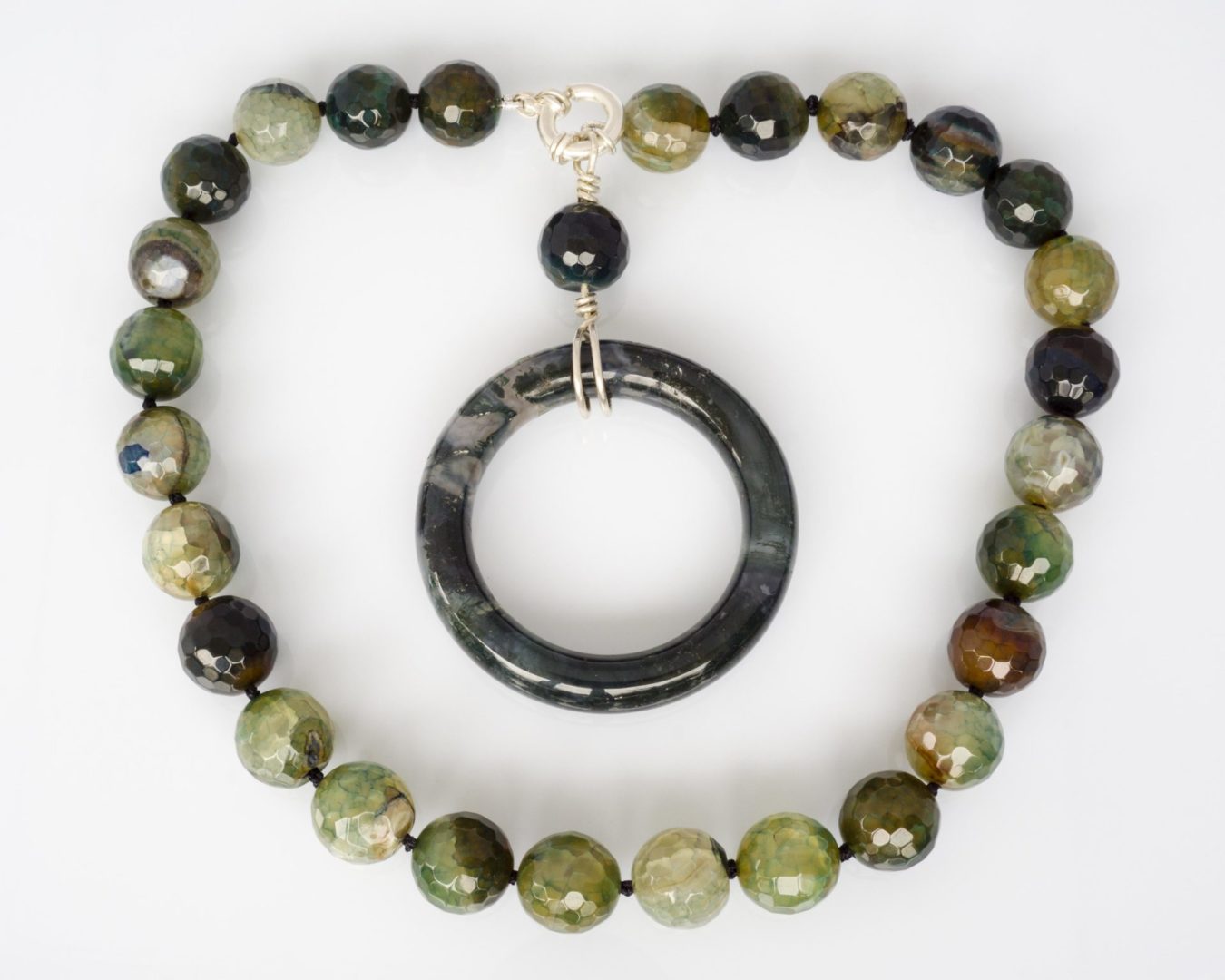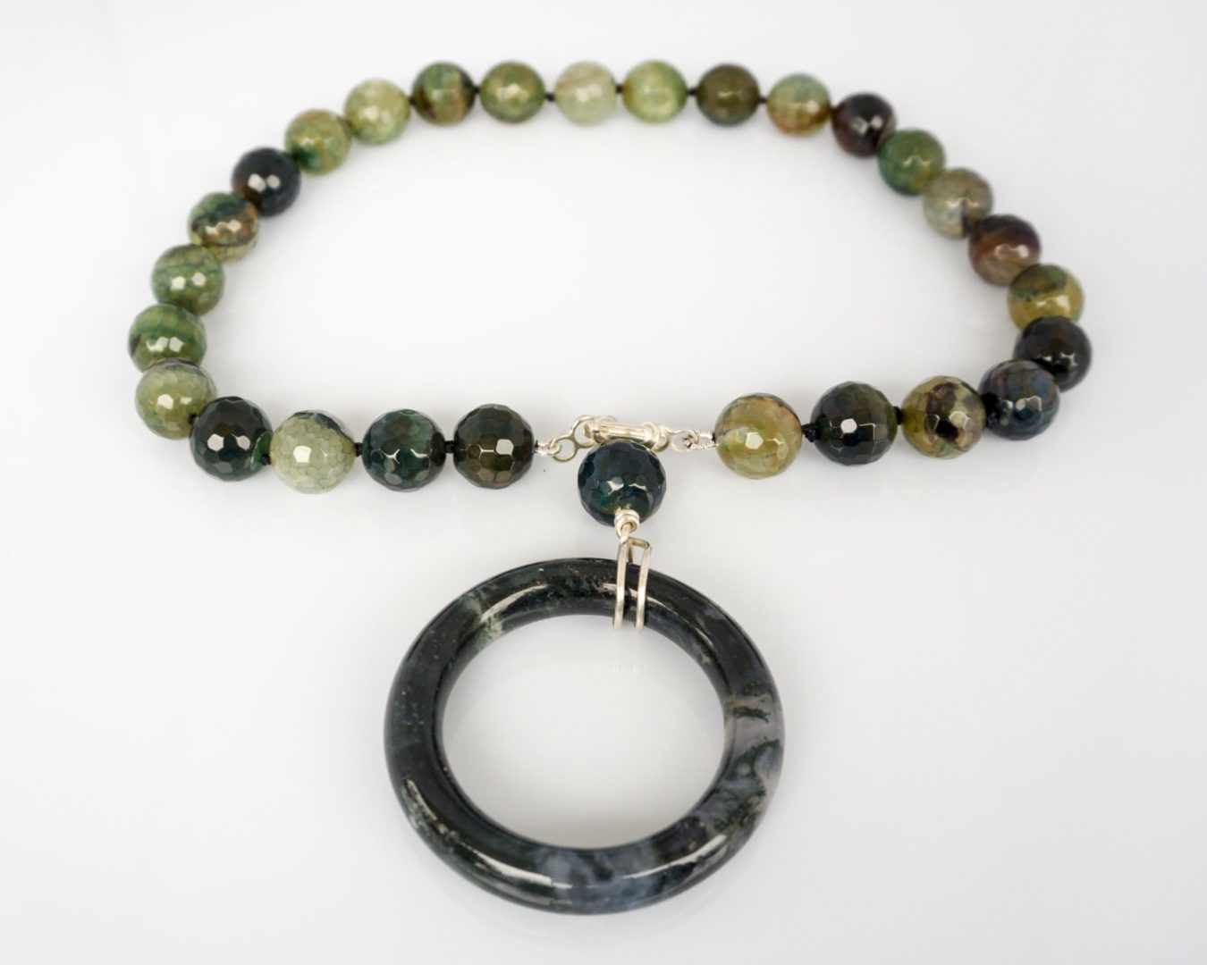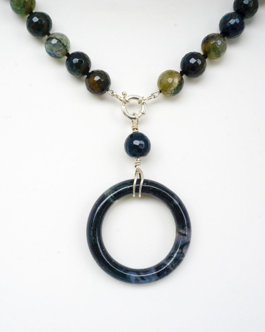 Colgante en forma de Aro de Ágata Musgosa color verde botella. En Collar corto de Ágatas craqueladas con reasa marinera en Plata de Ley.