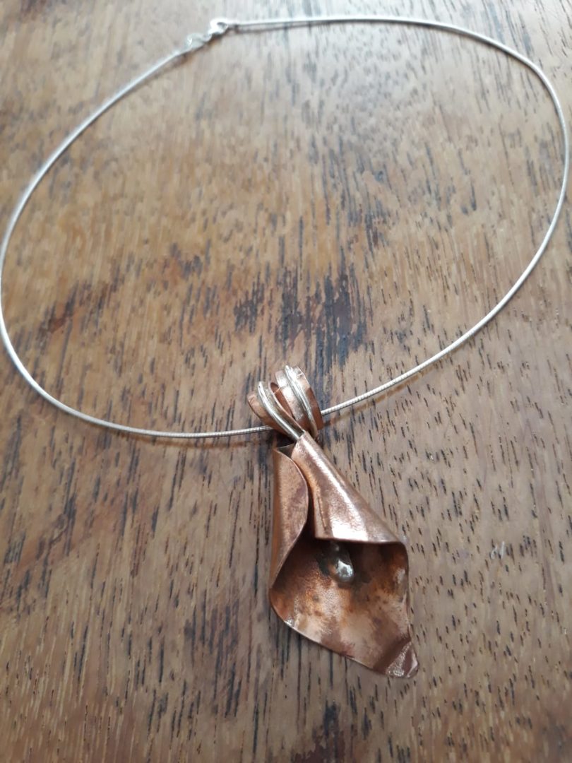 Colgante en forma de flor cala en cobre y plata de ley con cadena semirígida de 1mm de grosor en plata de ley.