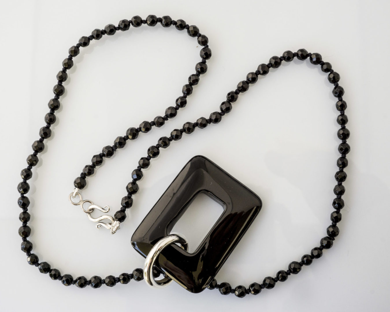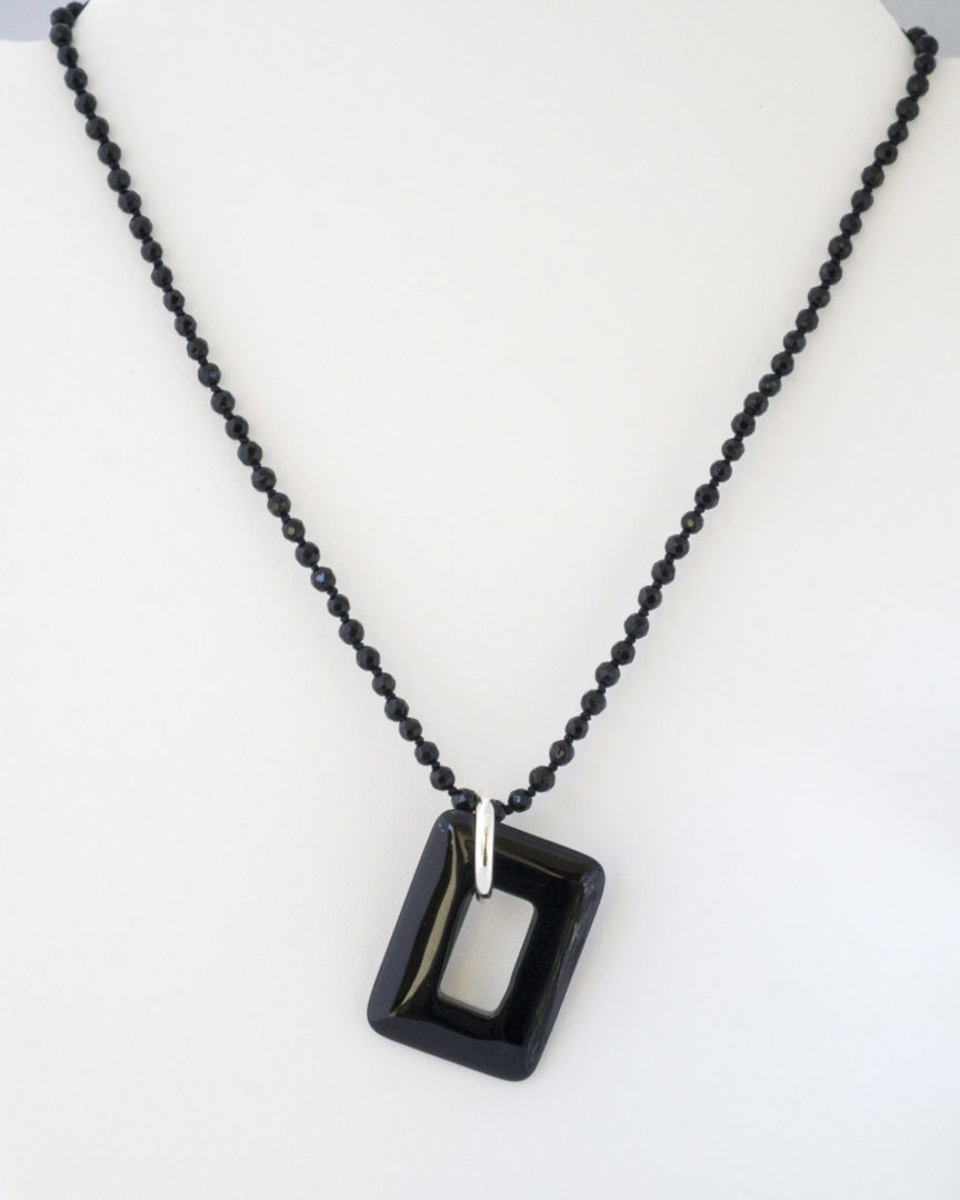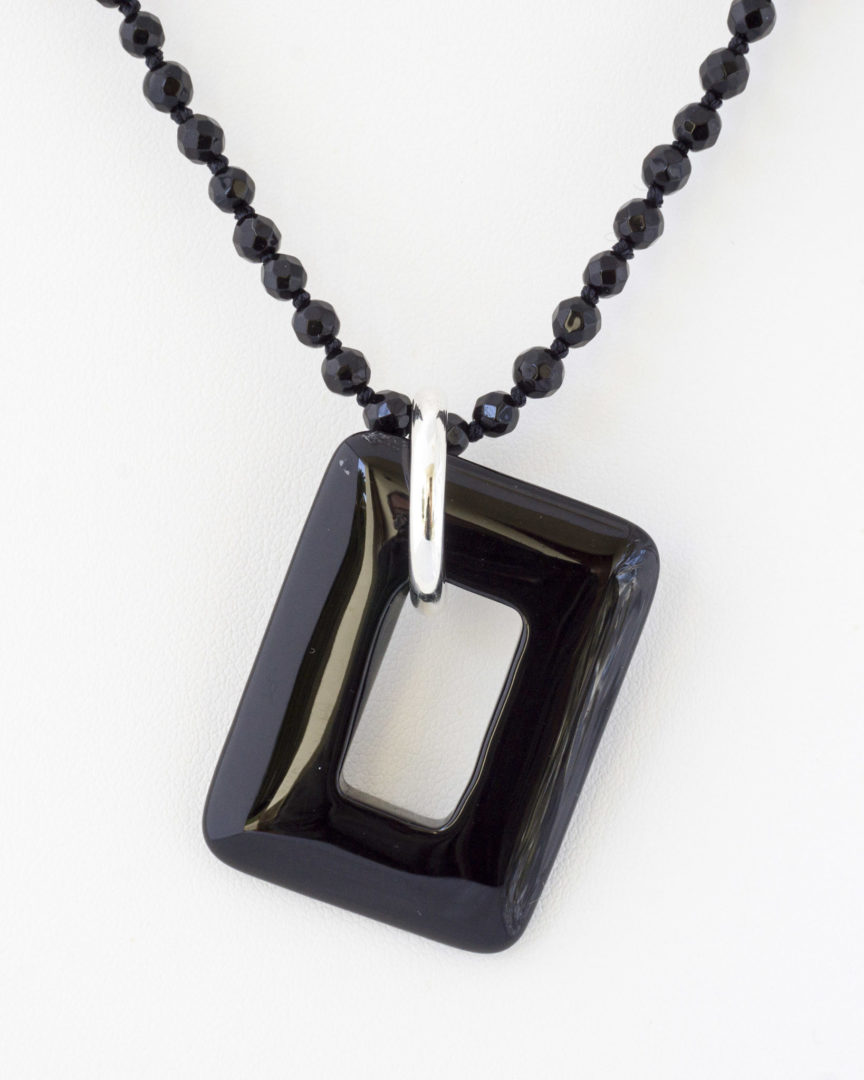 Colgante de Ónix rectangular y Collar en piedras facetadas de Ónix de 4mm. enfilado en hilo y argolla en plata.
