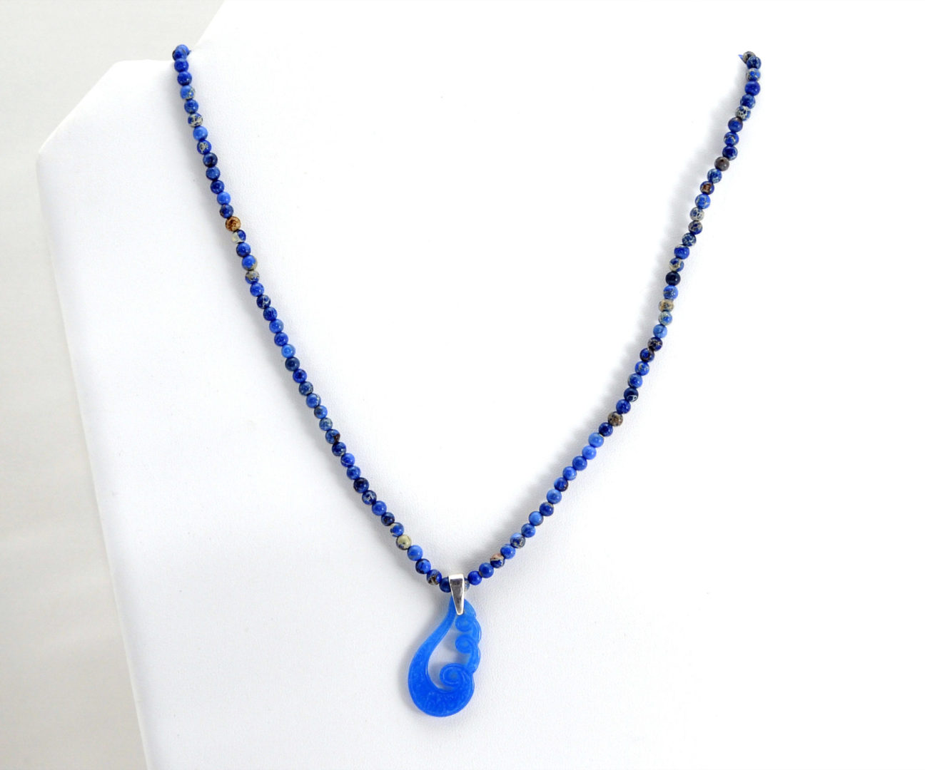 Colgante Jade Azul con motivo. Con tira de xilopalo en el tono del colgante. Cierre y reasa en plata.