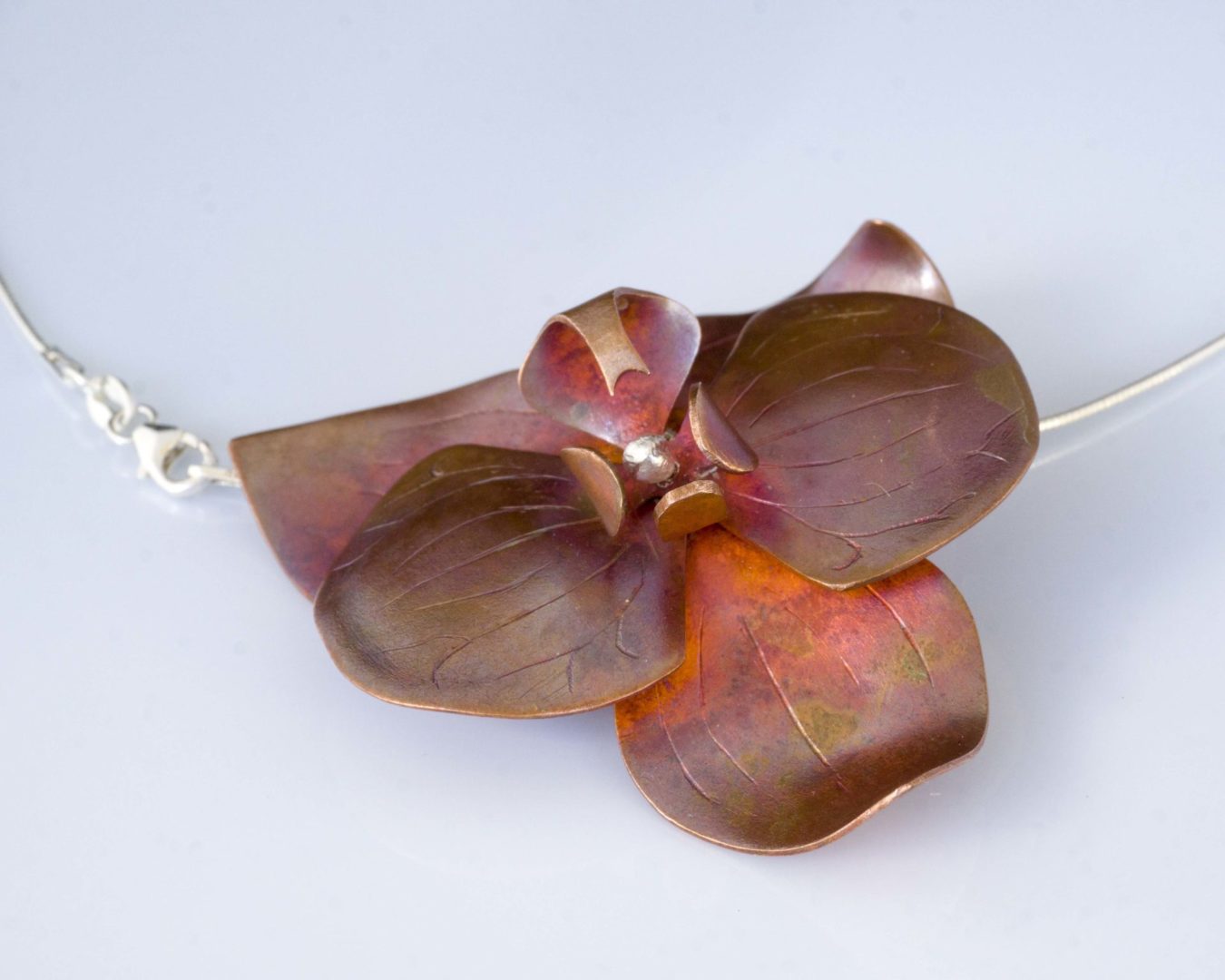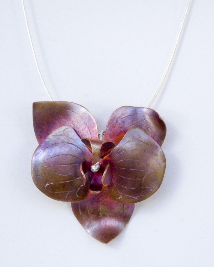 Colgante en forma de Orquídea covertible en broche en uno. Hecho en Cobre y Plata de Ley.