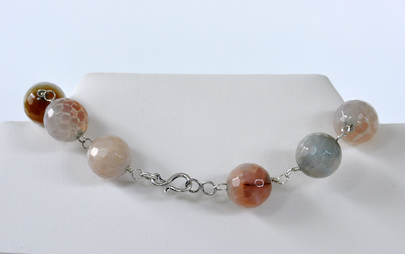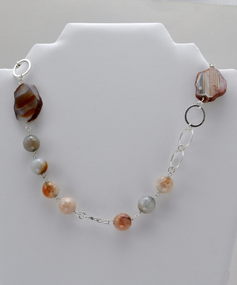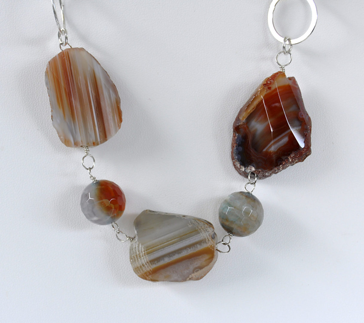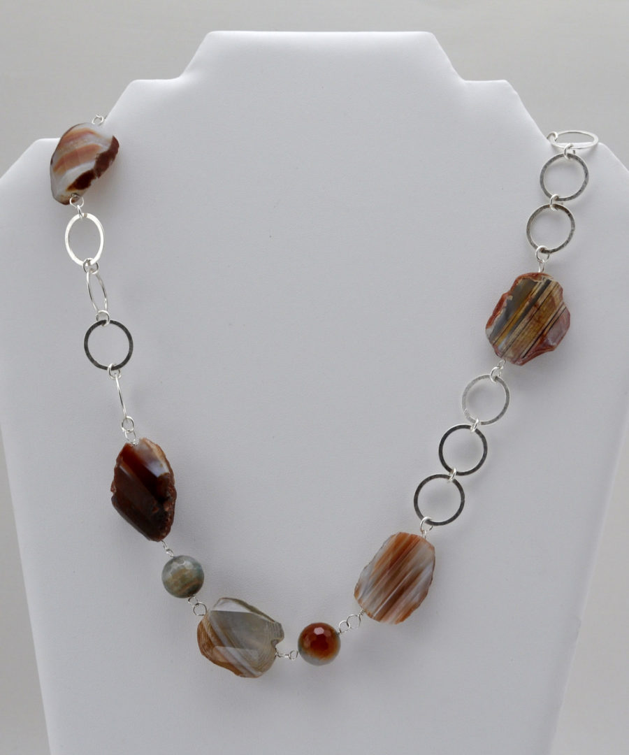 Collar enfilado en hilo de plata de 0,5 mm. de grosor. Con cinco ágatas bandeadas irregulares facetadas en tonos grises y caldero, nueve bolas de ágatas facetadas en los mismos tonos, intercalando trozos de cadena de plata hecha con arandelas planas y pequeñas arandelas de unión de hilo redondo.De 58 cm. de largo de extremo a extremo del collar.