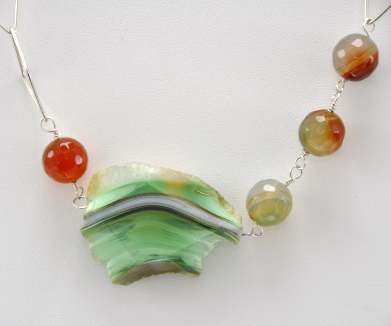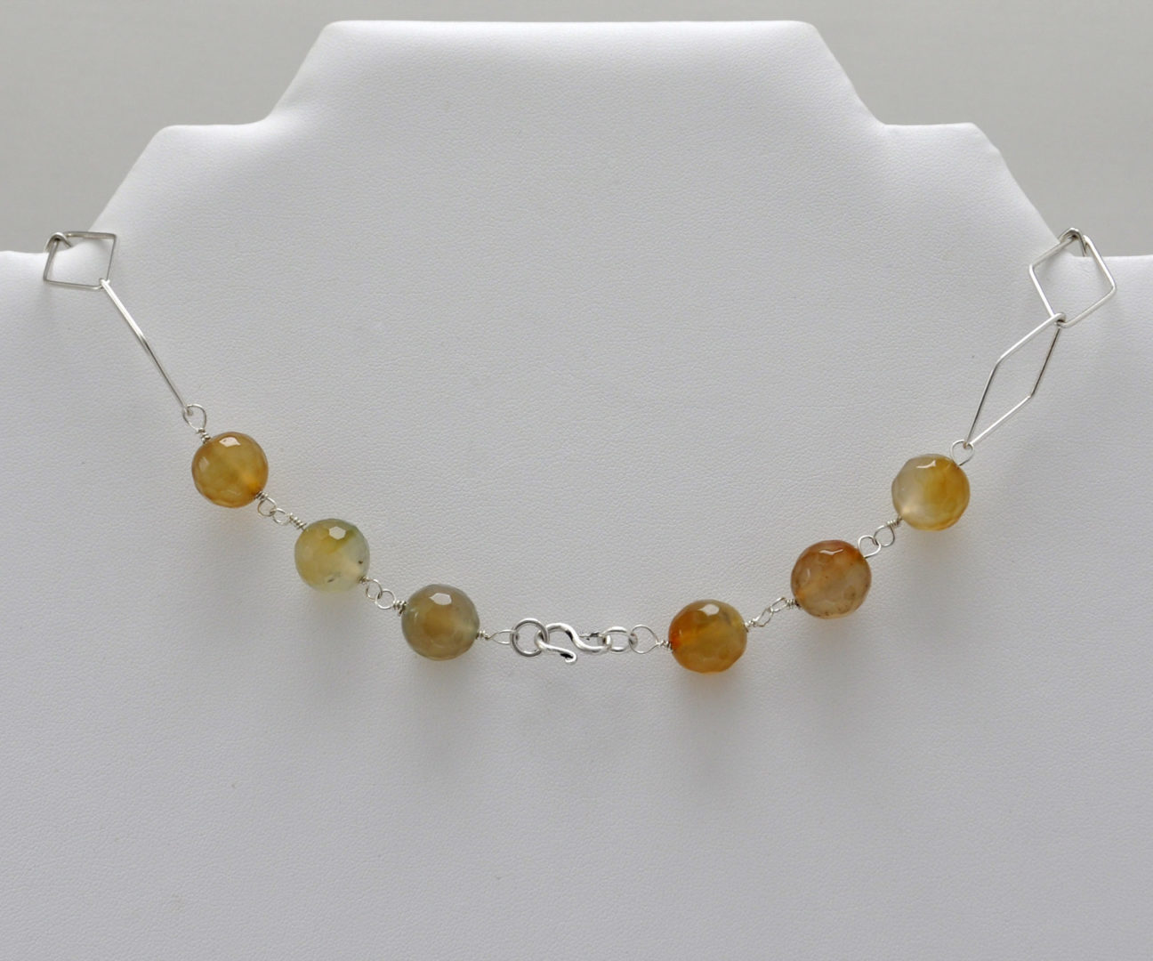 Collar enfilado en hilo de plata con dos ágatas irregulares facetadas en tono verde-amarillo-marrón, dieciseis bolas facetadas en los mismos tonos , cadena de plata en forma de rombo. Con cierre en plata.
