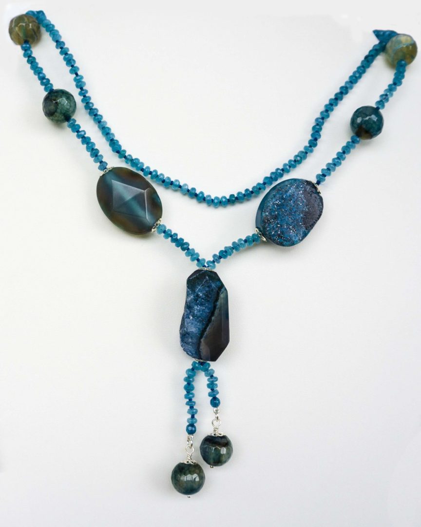 Collar largo convertible en corto dos vueltas. Con Ágatas Azules bandeadas, la central con drusa y jade azul. Casquillas y cierre en Plata de ley. Enfilado en Hilo.