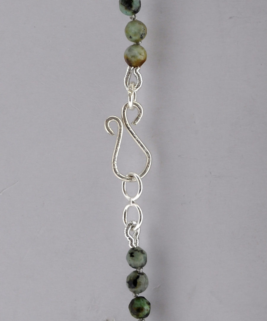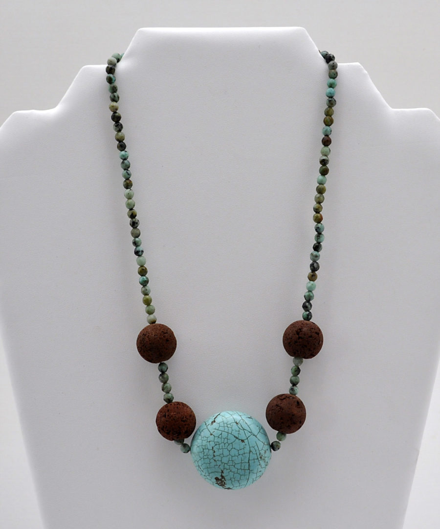 Gargantilla realizada con bolas de turquesa africana, turqesa grande natural central y cuatro bolas de lava marrón. Enfilado en hilo de acero forrado y con cierre de plata artesanal.