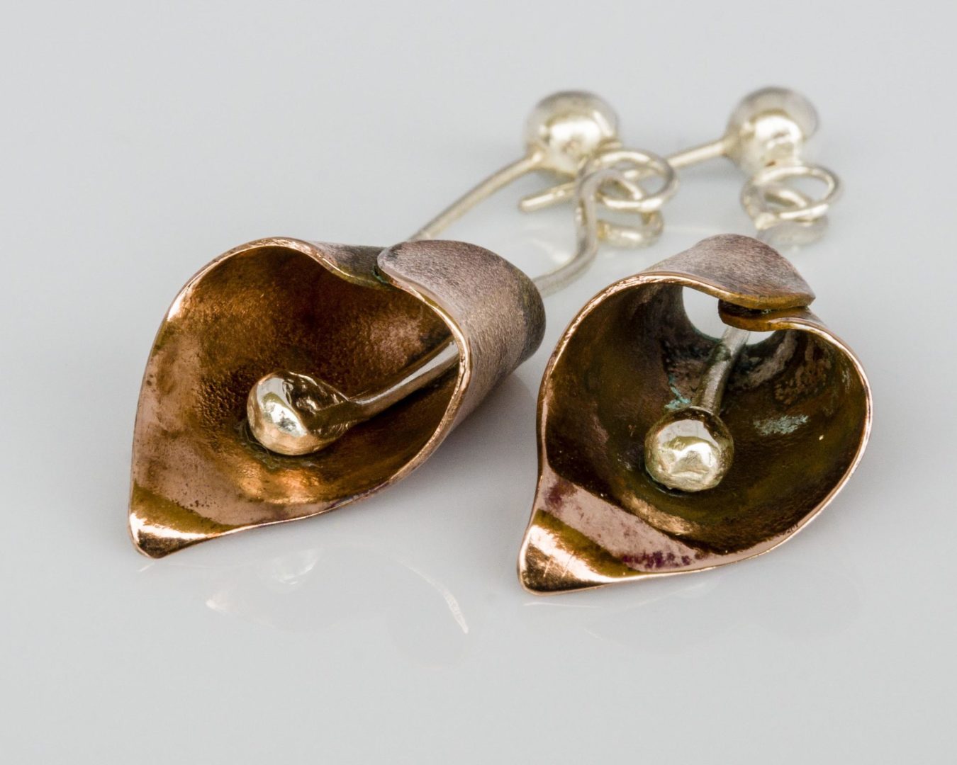 Pendientes de bola a presión con forma de cala en cobre y plata envejecidos..