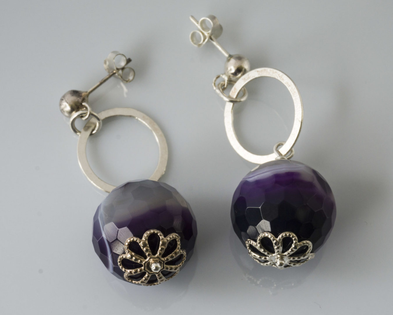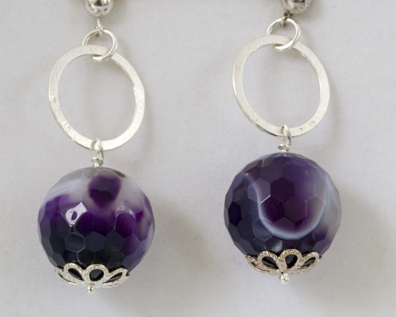 Pendientes en Plata con Piedras de Ágatas bandeadas y facetadas moradas y Aro de plata.