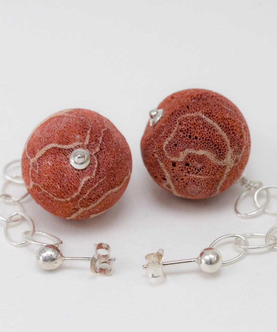 Pendientes de bola con tuerca de presión en Plata de Ley. Alfiler de tope plano, casquillas lisas y enfilado en Plata. Cadena de plata en hilo redondo. Bolas de Coral Esponja de 1,80 cm.